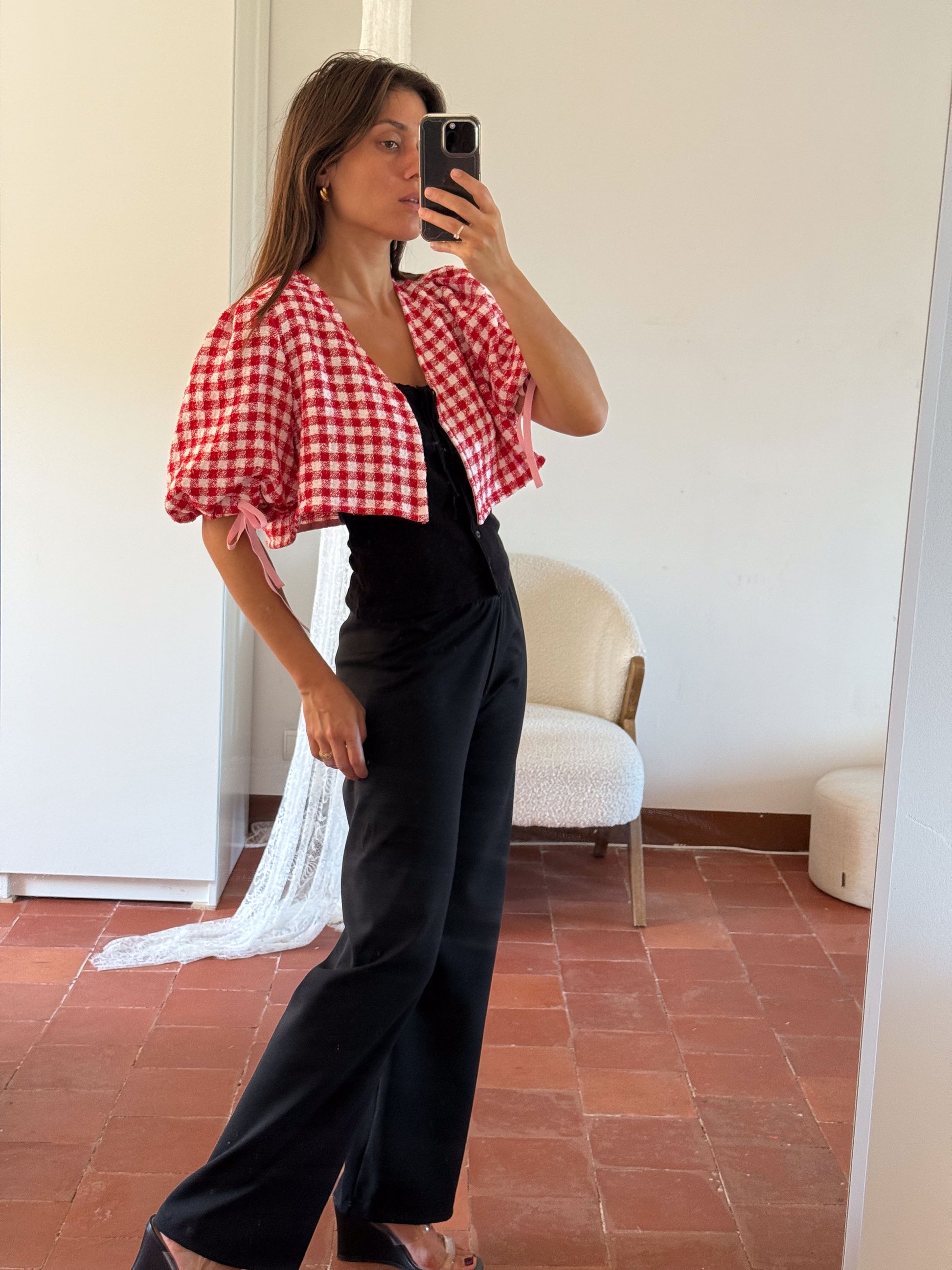Crop top with puffy sleeves made of italian cotton tweed from luxury deadstock